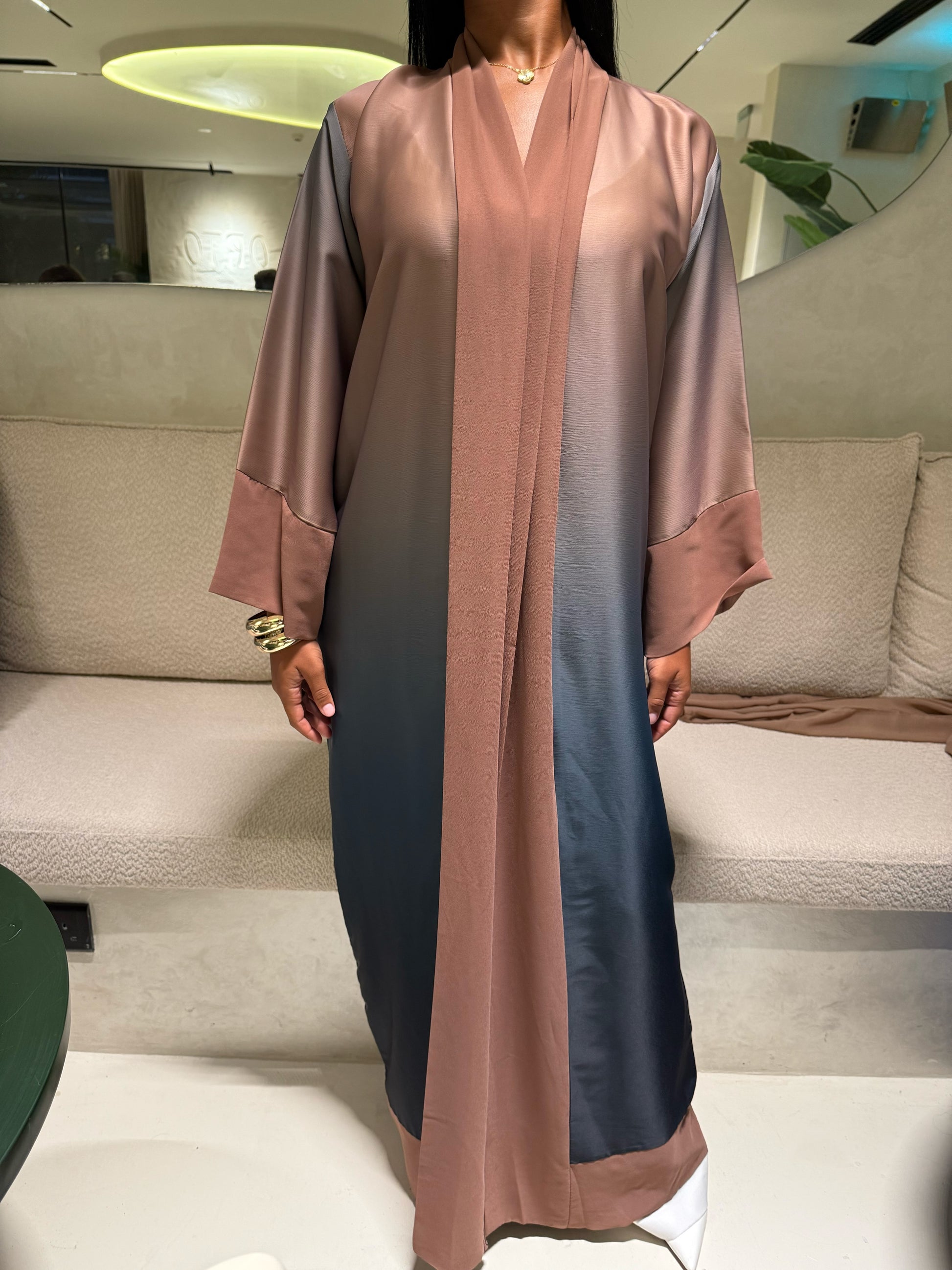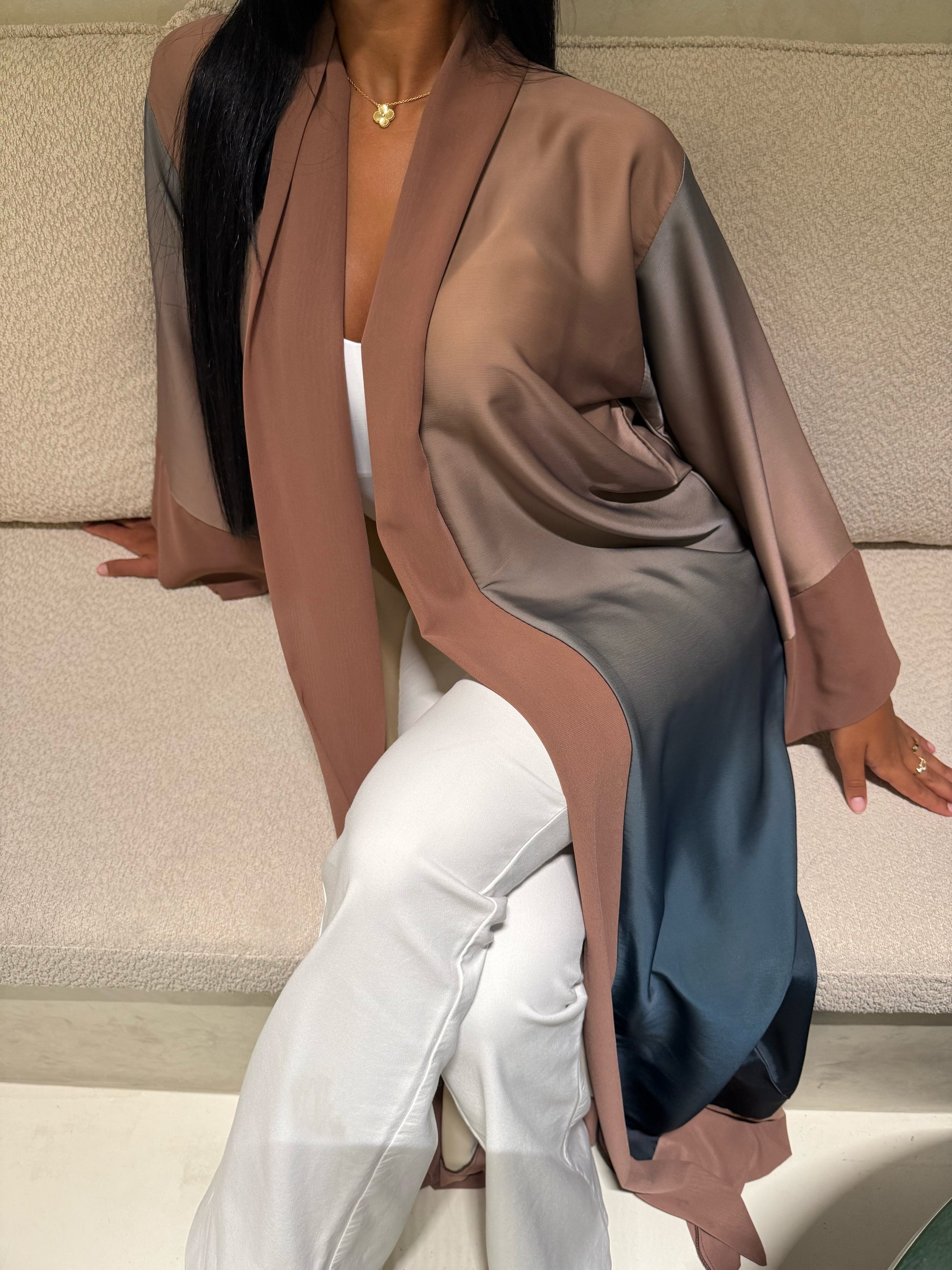 Cette abaya en satin dégradé combine élégance et modernité. La transition subtile entre les teintes taupe et bleu marine crée un effet visuel captivant, tout en conservant une silhouette fluide et sophistiquée. Le satin, doux et brillant, apporte une légèreté incomparable, tandis que la coupe simple et épurée assure un look raffiné. Parfaite pour les occasions spéciales ou un événement chic, cette abaya s'impose comme un choix élégant et contemporain.