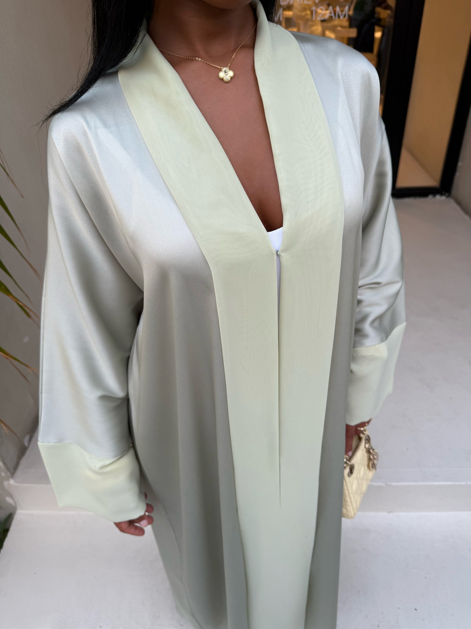 Découvrez notre kimono de couleur vert pastel une pièce à la fois sobre et luxueuse, pensée pour sublimer chaque silhouette avec douceur. Confectionnée dans un tissu satiné fluide à la teinte vert amande subtile, elle se distingue par ses finitions épurées, sa coupe longue droite et son tombé léger.