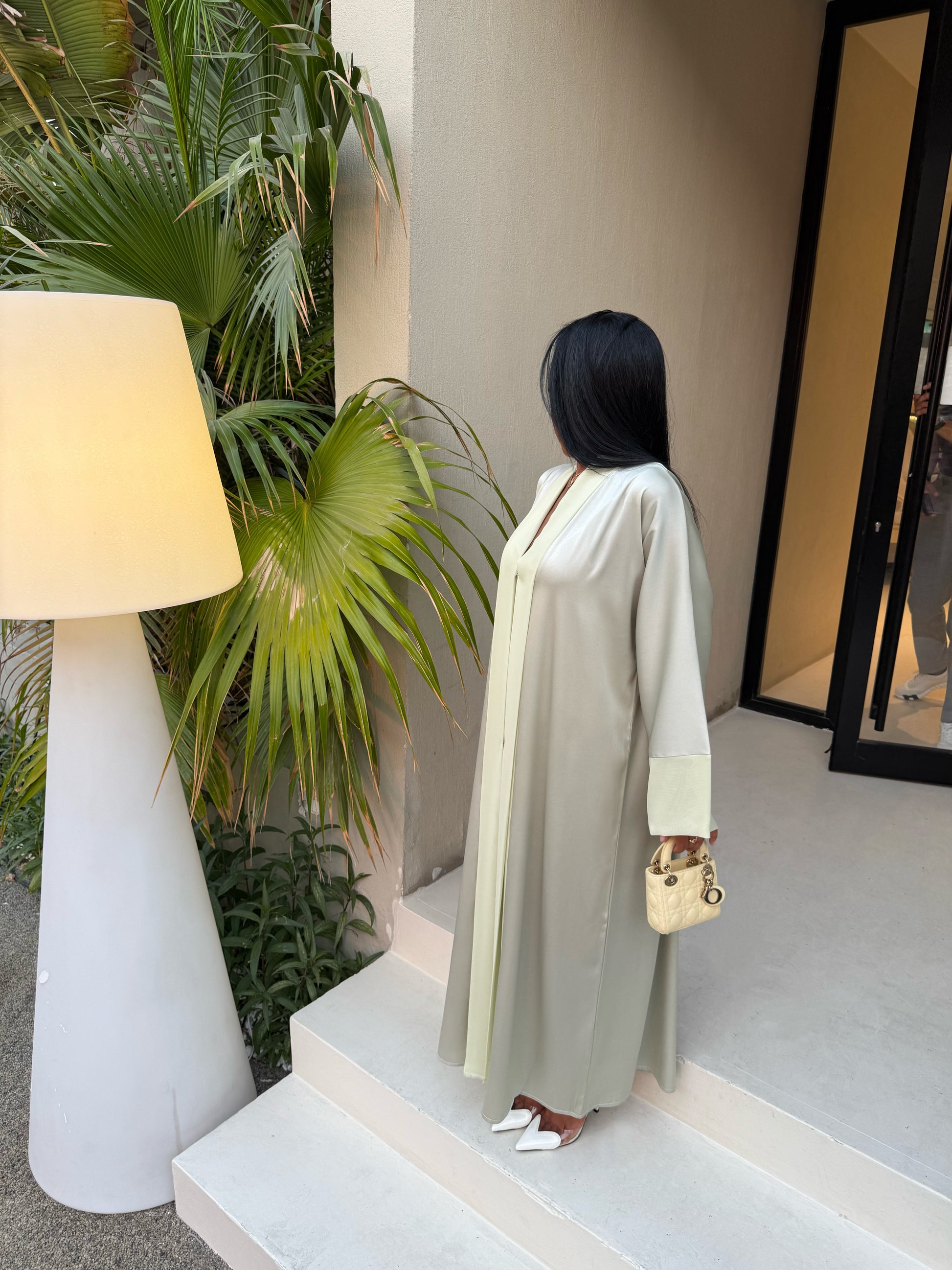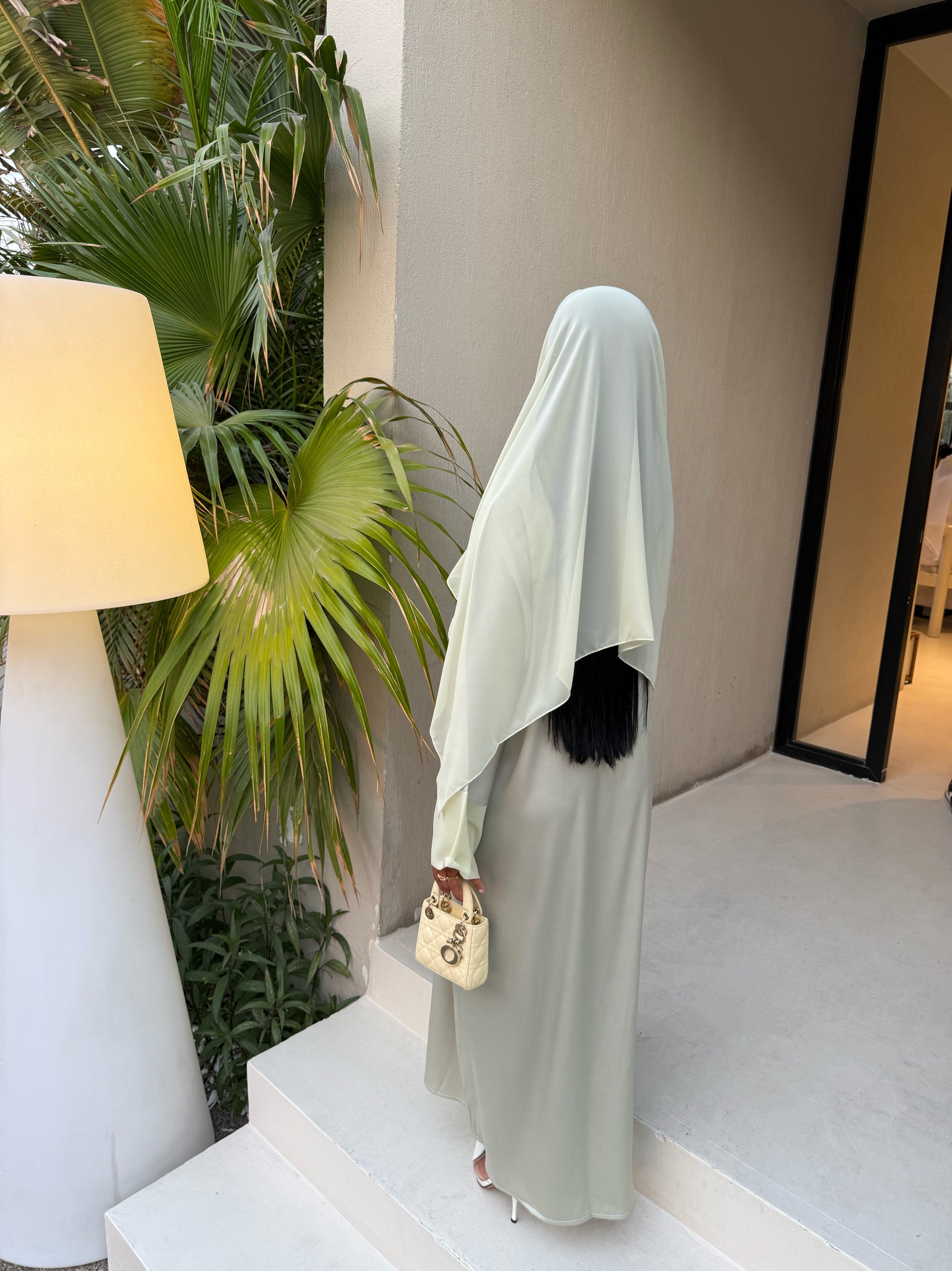 Associez-la à des talons blancs et un mini sac structuré pour un look chic et sophistiqué. Idéale portée avec un hijab en soie ou coton fluide dans des tons nude ou olive.
